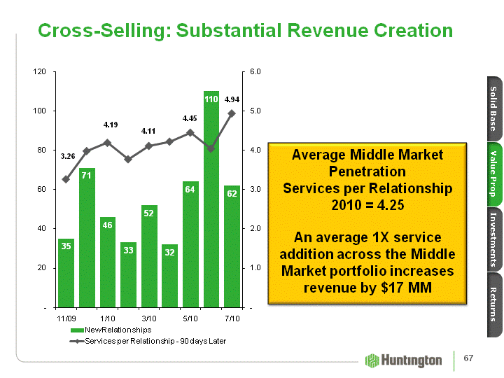 | Cross-Selling: Substantial Revenue Creation (CHART) Average Middle Market PenetrationServices per Relationship2010 = 4.25An average 1X service addition across the Middle Market portfolio increases revenue by $17 MM Solid Base Investments Returns Value Prop 67 |