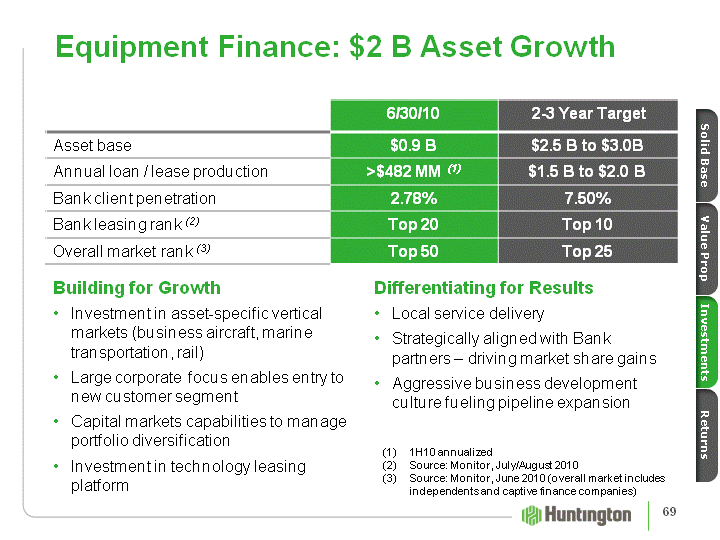 | Talent: Attracting Industry's Best New ExecutivesRegional President, Cleveland Regional President, PittsburghCommercial Regional Manager, East MichiganCommercial Regional Manager, ColumbusPresident, Huntington Equipment FinanceTreasury Management DirectorCommercial Strategy DirectorLarge Corporate Banking DirectorInvesting Their Future in HuntingtonProven track records at competitor banksJPM Chase; RBS-Citizens; PNC/NCC; Comerica; Fifth-Third; Key Recruiting and hiring continues at executive level 32 new customer facing bankers Solid Base Investments Returns Value Prop 68 |