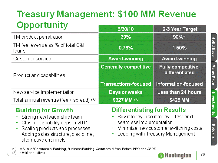 | Solid Base Investments Returns Value Prop Value Prop Building for GrowthStrong new leadership teamClosing capability gaps in 2011Scaling products and processesAdding sales structure, discipline, alternative channels = Sum of Commercial Banking, Business Banking, Commercial Real Estate, PFG and AFDS1H10 annualized Differentiating for ResultsBuy it today, use it today - fast and seamless implementationMinimize new customer switching costsLeading with Treasury Management Treasury Management: $100 MM Revenue Opportunity 70 |