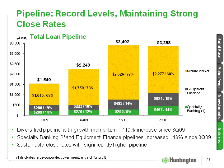 | (CHART) Pipeline: Record Levels, Maintaining Strong Close Rates ($MM) Diversified pipeline with growth momentum - 119% increase since 3Q09Specialty Banking (1) and Equipment Finance pipelines increased 118% since 3Q09Sustainable close rates with significantly higher pipeline Total Loan Pipeline $209 / 14% $286 / 19% $1,045 / 68% $276 / 12% $223 / 10% $1,750 / 78% $293 / 9% $483 / 14% $2,626 / 77% $457 / 14% $624 / 19% $2,277 / 68% Solid Base Investments Returns Value Prop $1,540 $2,249 $3,402 $3,358 (1) Includes large corporate, government, and not-for-profit 71 |