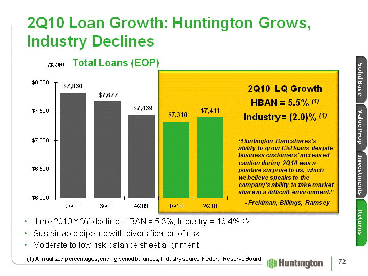 | 2Q10 Loan Growth: Huntington Grows, Industry Declines ($MM) June 2010 YOY decline: HBAN = 5.3%, Industry = 16.4% (1)Sustainable pipeline with diversification of risk Moderate to low risk balance sheet alignment (1) Annualized percentages, ending period balances; Industry source: Federal Reserve Board Total Loans (EOP) Solid Base Investments Returns Value Prop 2Q10 LQ GrowthHBAN = 5.5% (1) Industry = (2.0)% (1) (CHART) "Huntington Bancshares's ability to grow C&I loans despite business customers' increased caution during 2Q10 was a positive surprise to us, which we believe speaks to the company's ability to take market share in a difficult environment." - Freidman, Billings, Ramsey 72 |
