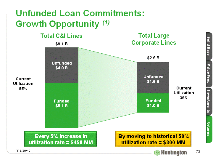 | Unfunded Loan Commitments: Growth Opportunity (1) Solid Base Investments Returns Value Prop (CHART) (CHART) Total C&I Lines (1) 6/30/10 Total Large Corporate Lines Current Utilization 55% Funded$5.1 B Unfunded$4.0 B $9.1 B Every 5% increase in utilization rate = $450 MM Funded$1.0 B Unfunded$1.6 B $2.6 B Current Utilization 39% By moving to historical 50% utilization rate = $300 MM 73 |