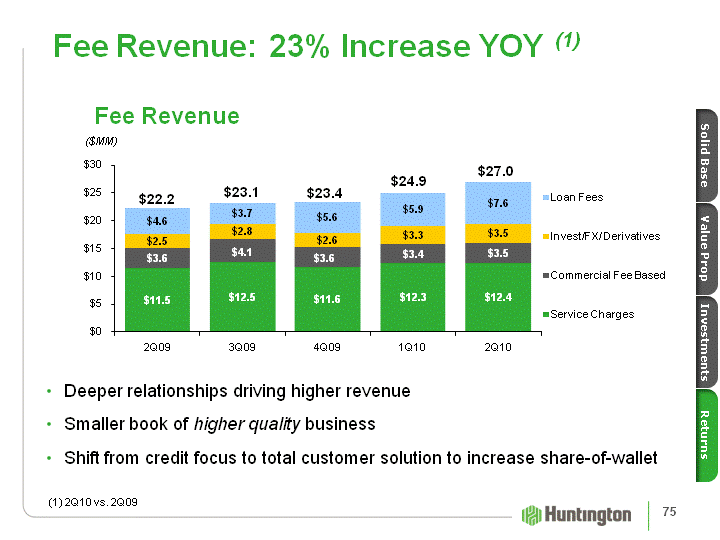 | (CHART) Fee Revenue: 23% Increase YOY (1) ($MM) Deeper relationships driving higher revenueSmaller book of higher quality businessShift from credit focus to total customer solution to increase share-of-wallet Fee Revenue Solid Base Investments Returns Value Prop $22.2 $23.1 $23.4 $24.9 $27.0 (1) 2Q10 vs. 2Q09 75 |