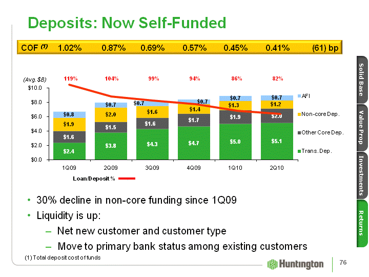 | (CHART) (CHART) Deposits: Now Self-Funded (Avg. $B) 30% decline in non-core funding since 1Q09Liquidity is up:Net new customer and customer typeMove to primary bank status among existing customers Solid Base Investments Returns Value Prop 119% 104% 99% 94% 86% 82% COF (1) 1.02% 0.87% 0.69% 0.57% 0.45% 0.41% (61) bp Loan/Deposit % (1) Total deposit cost of funds 76 |