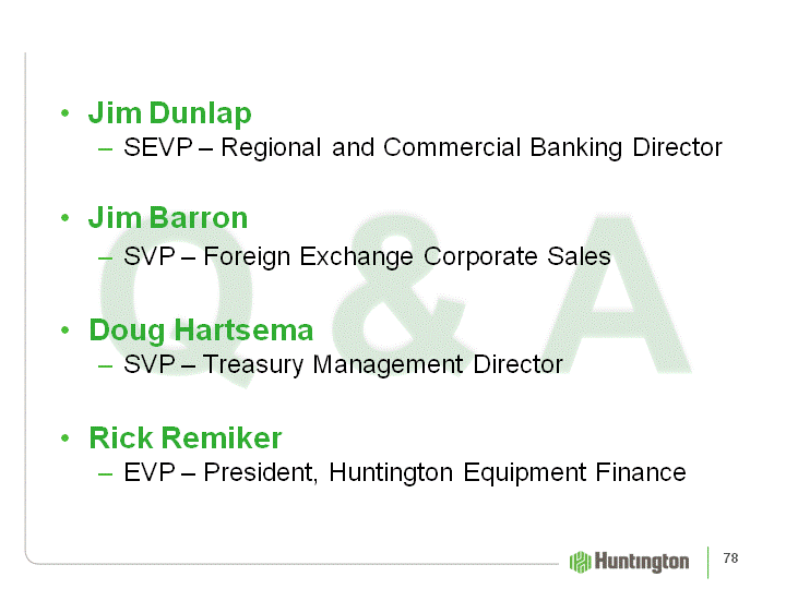 | Q & A Jim Dunlap SEVP - Regional and Commercial Banking Director Jim Barron SVP - Foreign Exchange Corporate Sales Doug Hartsema SVP - Treasury Management DirectorRick Remiker EVP - President, Huntington Equipment Finance 78 |