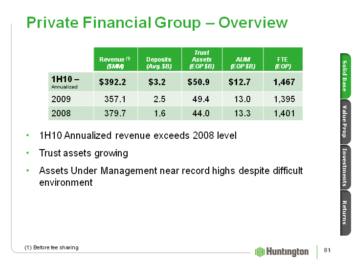 | Private Financial Group - Overview Revenue (1)($MM) Deposits (Avg. $B) Trust Assets (EOP $B) AUM (EOP $B) FTE(EOP) 1H10 - Annualized $392.2 $3.2 $50.9 $12.7 1,467 2009 357.1 2.5 49.4 13.0 1,395 2008 379.7 1.6 44.0 13.3 1,401 Before fee sharing Solid Base Investments Returns Value Prop 1H10 Annualized revenue exceeds 2008 levelTrust assets growingAssets Under Management near record highs despite difficult environment 81 |