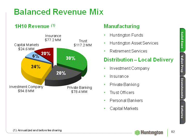 | (CHART) Insurance$77.2 MM Balanced Revenue Mix Solid Base Investments Returns Value Prop Trust$117.2 MM Private Banking$78.4 MM Investment Company$94.8 MM Capital Markets$24.6 MM Annualized and before fee sharing 30% 20% 24% 6% 20% 1H10 Revenue (1) ManufacturingHuntington FundsHuntington Asset ServicesRetirement ServicesDistribution - Local DeliveryInvestment CompanyInsurancePrivate BankingTrust OfficersPersonal BankersCapital Markets 82 |