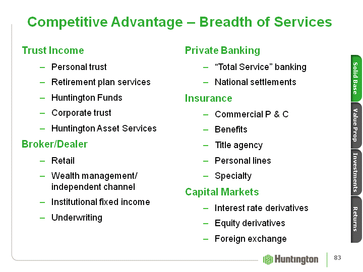 | Competitive Advantage - Breadth of Services Trust IncomePersonal trustRetirement plan servicesHuntington FundsCorporate trustHuntington Asset ServicesBroker/DealerRetailWealth management/ independent channelInstitutional fixed incomeUnderwriting Private Banking"Total Service" bankingNational settlementsInsuranceCommercial P & CBenefitsTitle agencyPersonal linesSpecialtyCapital MarketsInterest rate derivativesEquity derivativesForeign exchange Solid Base Investments Returns Value Prop 83 |
