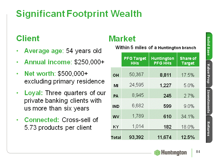 | Significant Footprint Wealth ClientAverage age: 54 years old Annual income: $250,000+Net worth: $500,000+ excluding primary residenceLoyal: Three quarters of our private banking clients with us more than six yearsConnected: Cross-sell of 5.73 products per client Solid Base Investments Returns Value Prop MarketWithin 5 miles of a Huntington branch PFG Target HHs Huntington PFG HHs Share of Target OH 50,367 8,811 17.5% MI 24,595 1,227 5.0% PA 8,945 245 2.7% IND 6,682 599 9.0% WV 1,789 610 34.1% KY 1,014 182 18.0% Total 93,392 11,674 12.5% 84 |
