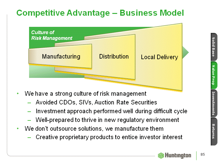 | Competitive Advantage - Business Model We have a strong culture of risk management Avoided CDOs, SIVs, Auction Rate SecuritiesInvestment approach performed well during difficult cycleWell-prepared to thrive in new regulatory environmentWe don't outsource solutions, we manufacture themCreative proprietary products to entice investor interest Manufacturing Distribution Local Delivery Culture of Risk Management Solid Base Investments Returns Value Prop 85 |