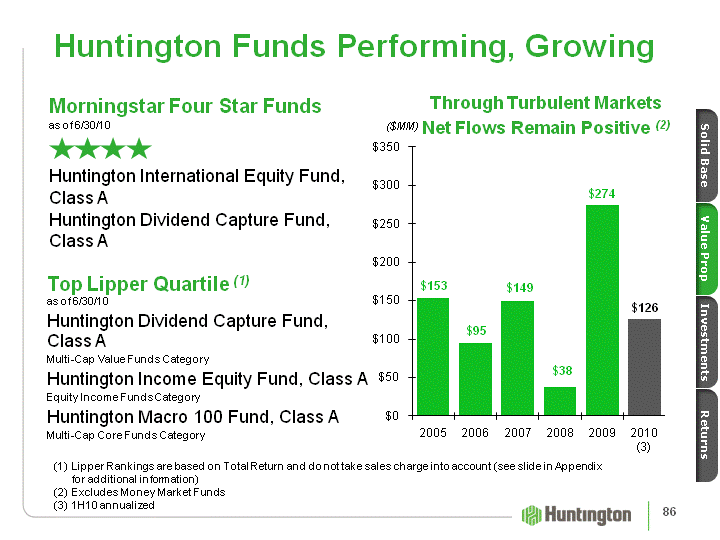 | Huntington Funds Performing, Growing Solid Base Investments Returns Value Prop Morningstar Four Star Funds as of 6/30/10Huntington International Equity Fund, Class AHuntington Dividend Capture Fund, Class A (CHART) Through Turbulent Markets Net Flows Remain Positive (2) Top Lipper Quartile (1) as of 6/30/10Huntington Dividend Capture Fund, Class AMulti-Cap Value Funds CategoryHuntington Income Equity Fund, Class AEquity Income Funds CategoryHuntington Macro 100 Fund, Class AMulti-Cap Core Funds Category ($MM) Lipper Rankings are based on Total Return and do not take sales charge into account (see slide in Appendix for additional information)Excludes Money Market Funds1H10 annualized 86 |