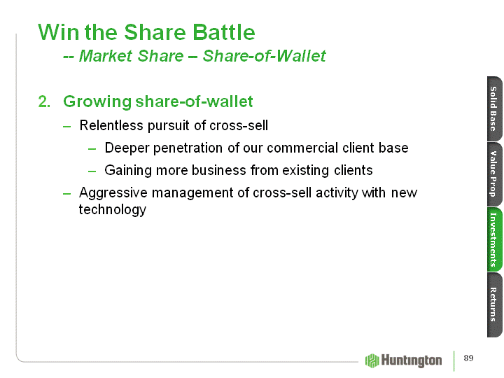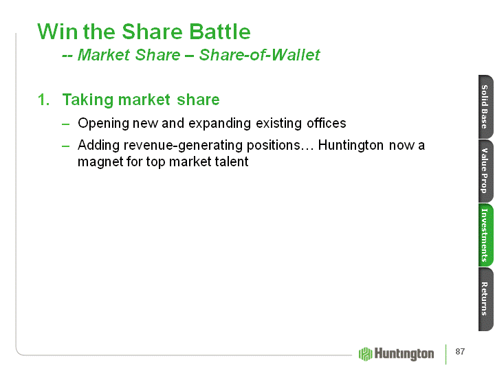 | Win the Share Battle -- Market Share - Share-of-Wallet Taking market shareOpening new and expanding existing officesAdding revenue-generating positions... Huntington now a magnet for top market talent Solid Base Investments Returns Value Prop 87 |