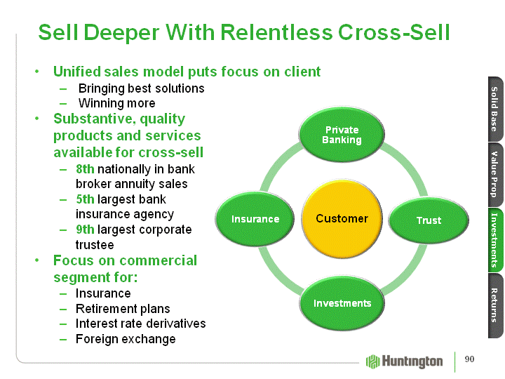 | Unified sales model puts focus on clientBringing best solutions Winning more Sell Deeper With Relentless Cross-Sell Substantive, quality products and services available for cross-sell8th nationally in bank broker annuity sales5th largest bank insurance agency9th largest corporate trusteeFocus on commercial segment for:InsuranceRetirement plansInterest rate derivativesForeign exchange Solid Base Investments Returns Value Prop 90 |