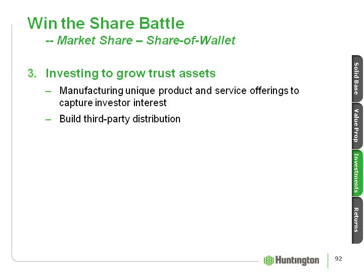 | Win the Share Battle -- Market Share - Share-of-Wallet Investing to grow trust assetsManufacturing unique product and service offerings to capture investor interestBuild third-party distribution Solid Base Investments Returns Value Prop 92 |