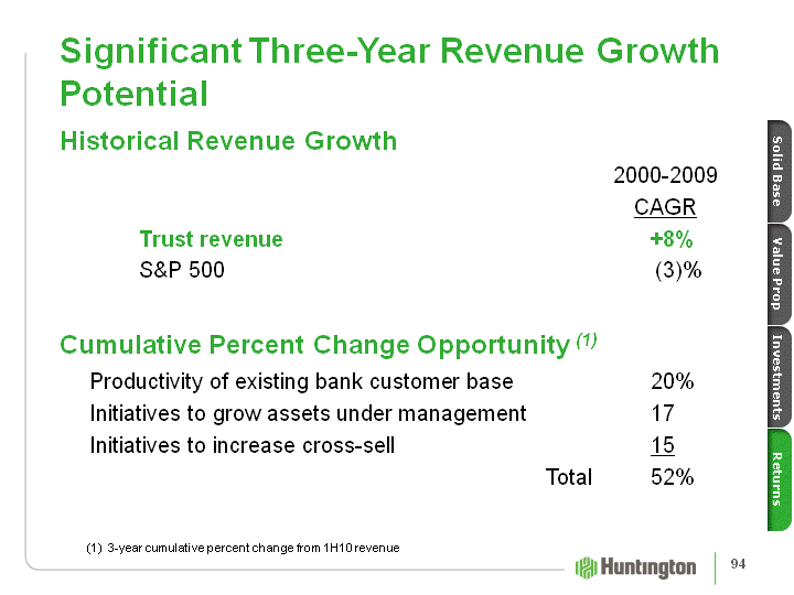 | Trust Assets Are Growing $5 B, or 12%, YTD (1) growth in assets under custody through Huntington Asset ServicesHuntington Funds distribution channelsWealth managementRetirement plansBroker / dealerBuilding third-party distributionWill launch three actively managed Exchange Traded Funds (ETF) in 1Q 20117 new + 3 expanded wealth management offices Solid Base Investments Returns Value Prop (1) Through July 31, 2010 93 |