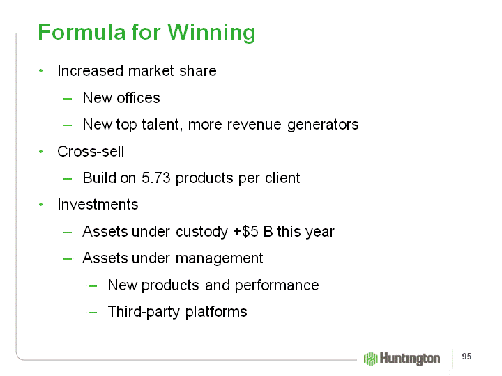 | Formula for Winning Increased market shareNew officesNew top talent, more revenue generatorsCross-sellBuild on 5.73 products per clientInvestmentsAssets under custody +$5 B this yearAssets under managementNew products and performanceThird-party platforms 95 |