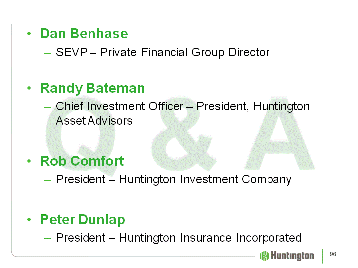 | Q & A Dan BenhaseSEVP - Private Financial Group DirectorRandy BatemanChief Investment Officer - President, Huntington Asset AdvisorsRob ComfortPresident - Huntington Investment CompanyPeter DunlapPresident - Huntington Insurance Incorporated 96 |