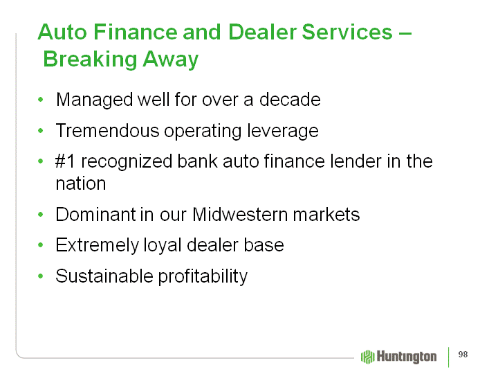 | Auto Finance and Dealer Services - Breaking Away Managed well for over a decadeTremendous operating leverage#1 recognized bank auto finance lender in the nationDominant in our Midwestern marketsExtremely loyal dealer baseSustainable profitability 98 |