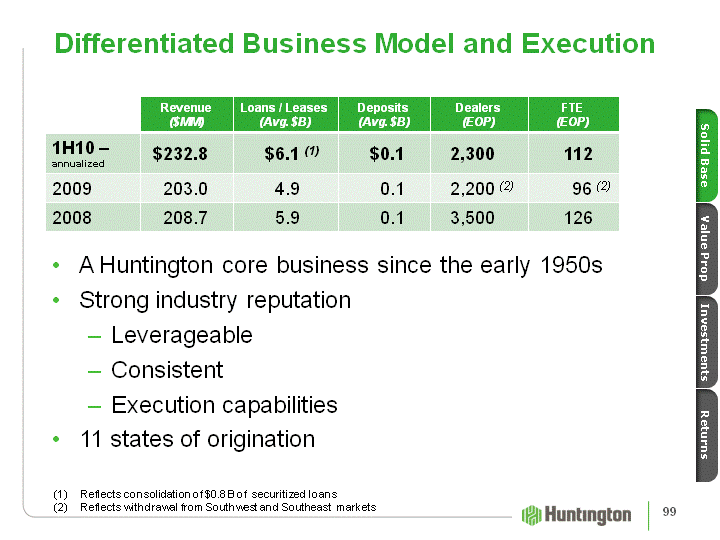 | Differentiated Business Model and Execution A Huntington core business since the early 1950sStrong industry reputationLeverageable Consistent Execution capabilities11 states of origination Solid Base Investments Returns Value Prop Revenue($MM) Loans / Leases (Avg. $B) Deposits (Avg. $B) Dealers(EOP) FTE(EOP) 1H10 - annualized $232.8 $6.1 (1) $0.1 2,300 112 2009 203.0 4.9 0.1 2,200 (2) 96 (2) 2008 208.7 5.9 0.1 3,500 126 Reflects consolidation of $0.8 B of securitized loansReflects withdrawal from Southwest and Southeast markets 99 |