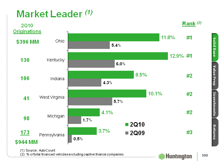 | (CHART) Market Leader (1) 2Q10Originations Rank (2) #1 #1 #2 #2 #2 #3 $396 MM 130 106 41 98 173 $944 MM Source : AutoCount % of total financed vehicles excluding captive finance companies Solid Base Investments Returns Value Prop 100 |