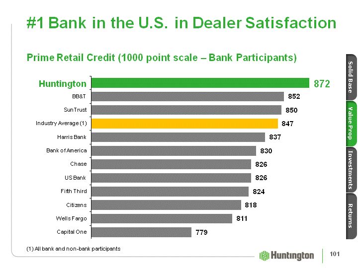 | (CHART) Prime Retail Credit (1000 point scale - Bank Participants) Huntington #1 Bank in the U.S. in Dealer Satisfaction Solid Base Investments Returns Value Prop (1) All bank and non-bank participants 101 |