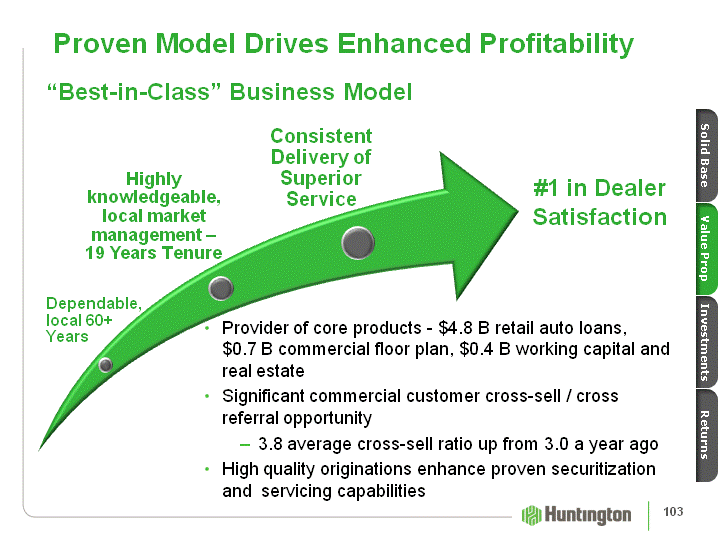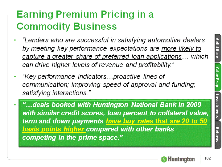 | Earning Premium Pricing in a Commodity Business "Lenders who are successful in satisfying automotive dealers by meeting key performance expectations are more likely to capture a greater share of preferred loan applications... which can drive higher levels of revenue and profitability.""Key performance indicators...proactive lines of communication; improving speed of approval and funding; satisfying interactions.""...deals booked with Huntington National Bank in 2009 with similar credit scores, loan percent to collateral value, term and down payments have buy rates that are 20 to 50 basis points higher compared with other banks competing in the prime space." Solid Base Investments Returns Value Prop 102 |