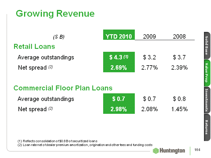 | ($ B) YTD 2010 2009 2008 Retail Loans Average outstandings $ 4.3 (1) $ 3.2 $ 3.7 Net spread (2) 2.69% 2.77% 2.39% Commercial Floor Plan Loans Commercial Floor Plan Loans Average outstandings $ 0.7 $ 0.7 $ 0.8 Net spread (2) 2.98% 2.08% 1.45% Growing Revenue Reflects consolidation of $0.8 B of securitized loansLoan rate net of dealer premium amortization, origination and other fees and funding costs Solid Base Investments Returns Value Prop 104 |