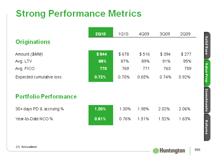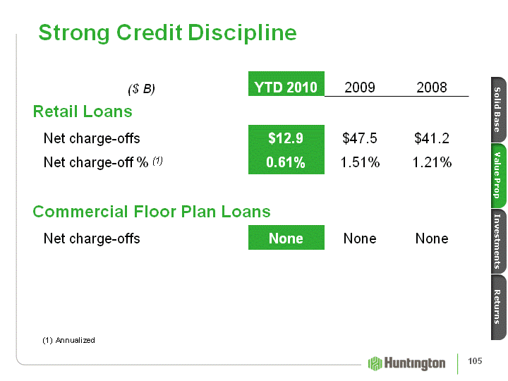 | ($ B) YTD 2010 2009 2008 Retail Loans Net charge-offs $12.9 $47.5 $41.2 Net charge-off % (1) 0.61% 1.51% 1.21% Commercial Floor Plan Loans Commercial Floor Plan Loans Net charge-offs None None None Strong Credit Discipline Annualized Solid Base Investments Returns Value Prop 105 |