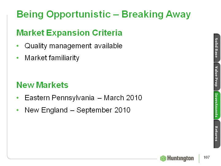 | Being Opportunistic - Breaking Away Market Expansion CriteriaQuality management availableMarket familiarityNew MarketsEastern Pennsylvania - March 2010New England - September 2010 Solid Base Investments Returns Value Prop 107 |