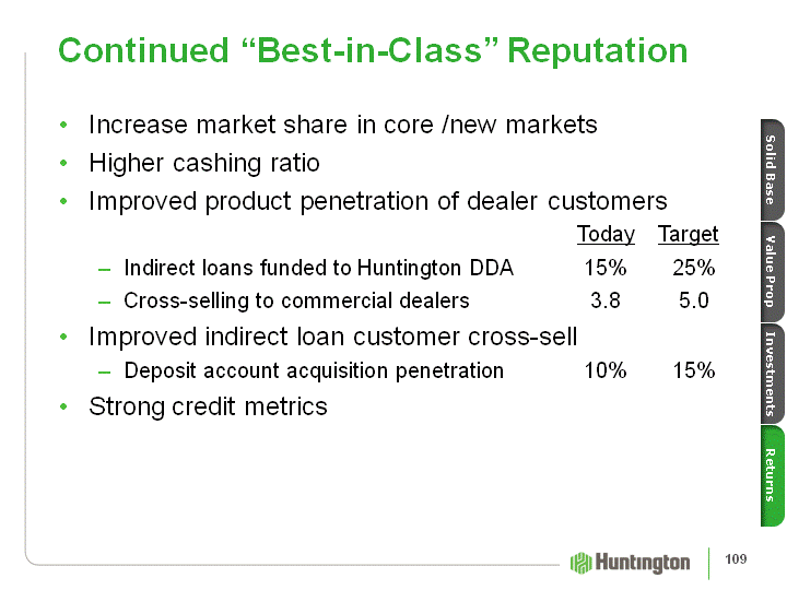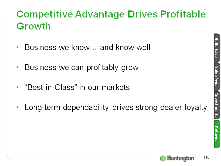| Continued "Best-in-Class" Reputation Increase market share in core /new marketsHigher cashing ratioImproved product penetration of dealer customers Today TargetIndirect loans funded to Huntington DDA 15% 25%Cross-selling to commercial dealers 3.8 5.0Improved indirect loan customer cross-sellDeposit account acquisition penetration 10% 15%Strong credit metrics Solid Base Investments Returns Value Prop 109 |