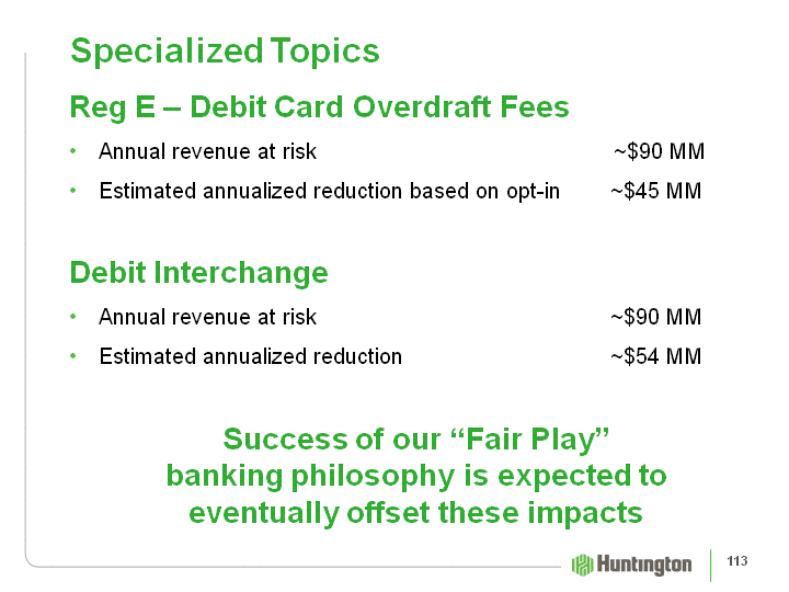| Specialized Topics Reg E - Debit Card Overdraft FeesAnnual revenue at risk ~$90 MMEstimated annualized reduction based on opt-in ~$45 MM Debit InterchangeAnnual revenue at risk ~$90 MMEstimated annualized reduction ~$54 MM Success of our "Fair Play" banking philosophy is expected to eventually offset these impacts 113 |