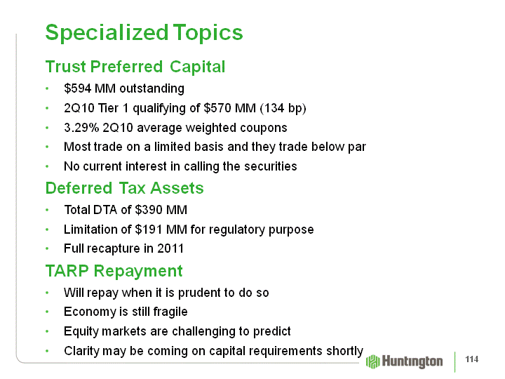 | Specialized Topics Trust Preferred Capital$594 MM outstanding2Q10 Tier 1 qualifying of $570 MM (134 bp)3.29% 2Q10 average weighted couponsMost trade on a limited basis and they trade below parNo current interest in calling the securitiesDeferred Tax AssetsTotal DTA of $390 MMLimitation of $191 MM for regulatory purposeFull recapture in 2011TARP RepaymentWill repay when it is prudent to do soEconomy is still fragileEquity markets are challenging to predictClarity may be coming on capital requirements shortly 114 |