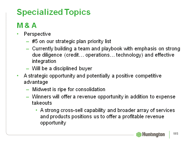| Specialized Topics M & APerspective#5 on our strategic plan priority listCurrently building a team and playbook with emphasis on strong due diligence (credit... operations... technology) and effective integrationWill be a disciplined buyerA strategic opportunity and potentially a positive competitive advantageMidwest is ripe for consolidationWinners will offer a revenue opportunity in addition to expense takeoutsA strong cross-sell capability and broader array of services and products positions us to offer a profitable revenue opportunity 115 |