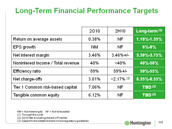 | Long-Term Financial Performance Targets 2Q10 2H10 Long-term (1) Return on average assets 0.38% NF 1.10%-1.35% EPS growth NM NF 6%-8% Net interest margin 3.46% 3.46%+/- 3.30%-3.75% Noninterest income / Total revenue 40% <40% 40%-50% Efficiency ratio 59% 59%+/- 50%-55% Net charge-offs 3.01% <2.17% (2) 0.35%-0.55% Tier 1 Common risk-based capital 7.06% NF TBD (3) Tangible common equity 6.12% NF TBD (3) NM = Not meaningful NF = Not forecastedThrough the cycle2Q10 rate excluding impact of FranklinSubject to the establishment of new regulatory guidelines 118 |
