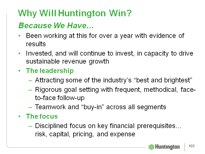 | Why Will Huntington Win? Because We Have...Been working at this for over a year with evidence of resultsInvested, and will continue to invest, in capacity to drive sustainable revenue growthThe leadershipAttracting some of the industry's "best and brightest"Rigorous goal setting with frequent, methodical, face- to-face follow-upTeamwork and "buy-in" across all segmentsThe focusDisciplined focus on key financial prerequisites... risk, capital, pricing, and expense 122 |