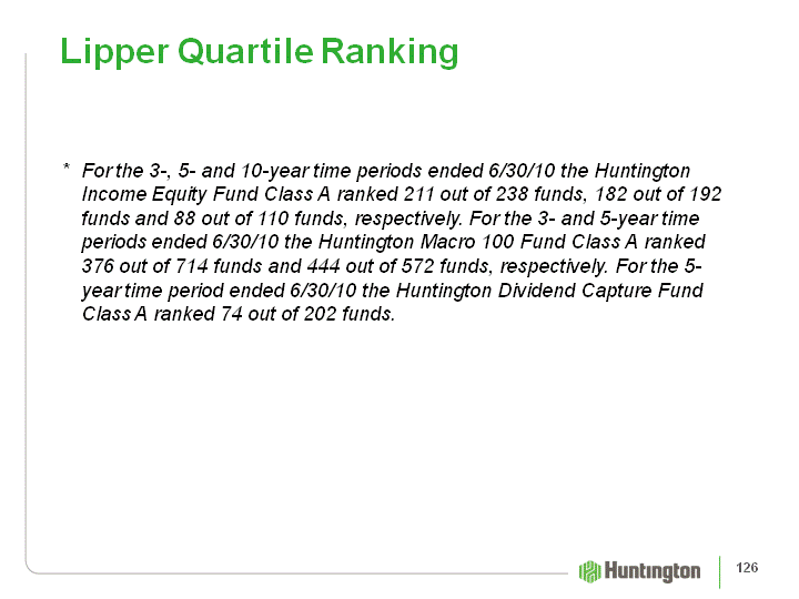 | Lipper Quartile Ranking * For the 3-, 5- and 10-year time periods ended 6/30/10 the Huntington Income Equity Fund Class A ranked 211 out of 238 funds, 182 out of 192 funds and 88 out of 110 funds, respectively. For the 3- and 5-year time periods ended 6/30/10 the Huntington Macro 100 Fund Class A ranked 376 out of 714 funds and 444 out of 572 funds, respectively. For the 5- year time period ended 6/30/10 the Huntington Dividend Capture Fund Class A ranked 74 out of 202 funds. 126 |