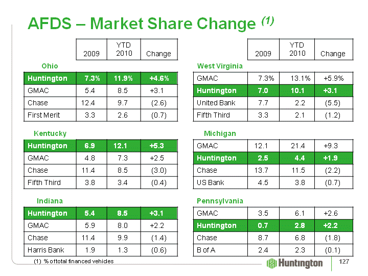 | AFDS - Market Share Change (1) AFDS - Market Share Change (1) 2009 YTD 2010 Change West Virginia GMAC 7.3% 13.1% +5.9% Huntington 7.0 10.1 +3.1 United Bank 7.7 2.2 (5.5) Fifth Third 3.3 2.1 (1.2) Michigan GMAC 12.1 21.4 +9.3 Huntington 2.5 4.4 +1.9 Chase 13.7 11.5 (2.2) US Bank 4.5 3.8 (0.7) Pennsylvania GMAC 3.5 6.1 +2.6 Huntington 0.7 2.8 +2.2 Chase 8.7 6.8 (1.8) B of A 2.4 2.3 (0.1) (1) % of total financed vehicles 127 |