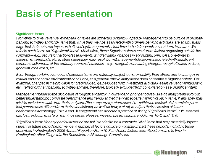 | Basis of Presentation Significant ItemsFrom time to time, revenue, expenses, or taxes are impacted by items judged by Management to be outside of ordinary banking activities and/or by items that, while they may be associated with ordinary banking activities, are so unusually large that their outsized impact is believed by Management at that time to be infrequent or short-term in nature. We refer to such items as "Significant Items". Most often, these Significant Items result from factors originating outside the company - e.g., regulatory actions/assessments, windfall gains, changes in accounting principles, one-time tax assessments/refunds, etc. In other cases they may result from Management decisions associated with significant corporate actions out of the ordinary course of business - e.g., merger/restructuring charges, recapitalization actions, goodwill impairment, etc. Even though certain revenue and expense items are naturally subject to more volatility than others due to changes in market and economic environment conditions, as a general rule volatility alone does not define a Significant Item. For example, changes in the provision for credit losses, gains/losses from investment activities, asset valuation writedowns, etc., reflect ordinary banking activities and are, therefore, typically excluded from consideration as a Significant Item.Management believes the disclosure of "Significant Items" in current and prior period results aids analysts/investors in better understanding corporate performance and trends so that they can ascertain which of such items, if any, they may wish to include/exclude from their analysis of the company's performance; i.e., within the context of determining how that performance differed from their expectations, as well as how, if at all, to adjust their estimates of future performance accordingly. To this end, Management has adopted a practice of listing "Significant Items" in its external disclosure documents (e.g., earnings press releases, investor presentations, and Forms 10-Q and 10 K)."Significant Items" for any particular period are not intended to be a complete list of items that may materially impact current or future period performance. A number of factors could significantly impact these periods, including those described in Huntington's 2009 Annual Report on Form 10-K and other factors described from time to time in Huntington's other filings with the Securities and Exchange Commission. 129 |