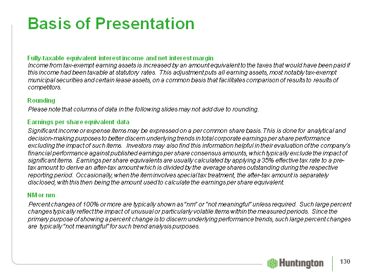 | Basis of Presentation Fully-taxable equivalent interest income and net interest marginIncome from tax-exempt earning assets is increased by an amount equivalent to the taxes that would have been paid if this income had been taxable at statutory rates. This adjustment puts all earning assets, most notably tax-exempt municipal securities and certain lease assets, on a common basis that facilitates comparison of results to results of competitors.RoundingPlease note that columns of data in the following slides may not add due to rounding.Earnings per share equivalent dataSignificant income or expense items may be expressed on a per common share basis. This is done for analytical and decision-making purposes to better discern underlying trends in total corporate earnings per share performance excluding the impact of such items. Investors may also find this information helpful in their evaluation of the company's financial performance against published earnings per share consensus amounts, which typically exclude the impact of significant items. Earnings per share equivalents are usually calculated by applying a 35% effective tax rate to a pre- tax amount to derive an after-tax amount which is divided by the average shares outstanding during the respective reporting period. Occasionally, when the item involves special tax treatment, the after-tax amount is separately disclosed, with this then being the amount used to calculate the earnings per share equivalent.NM or nmPercent changes of 100% or more are typically shown as "nm" or "not meaningful" unless required. Such large percent changes typically reflect the impact of unusual or particularly volatile items within the measured periods. Since the primary purpose of showing a percent change is to discern underlying performance trends, such large percent changes are typically "not meaningful" for such trend analysis purposes. 130 |
