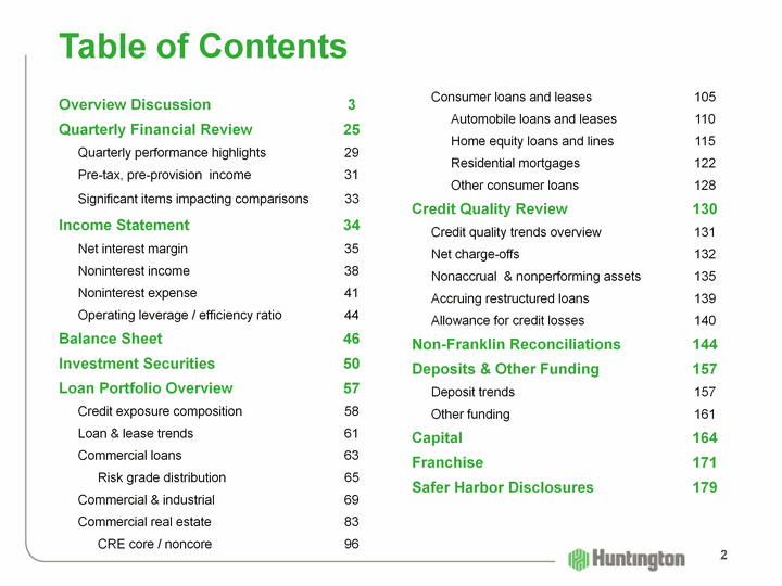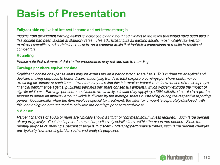 | Basis of Presentation Use of non-GAAP financial measuresThis presentation contains GAAP financial measures and non-GAAP financial measures where management believes it to be helpful in understanding Huntington's results of operations or financial position. Where non-GAAP financial measures are used, the comparable GAAP financial measure, as well as the reconciliation to the comparable GAAP financial measure can be found in this presentation and/or in the most recent quarterly earnings press release and related Quarterly Financial Review supplement filed on Form 8-K. This information can be found on Huntington's website at huntington-ir.com.Pre-Tax, Pre-Provision IncomeOne non-GAAP performance metric that Management believes is useful in analyzing underlying performance trends, is pre-tax, pre-provision income. This is the level of earnings adjusted to exclude the impact of:provision expense, which is excluded because its absolute level is elevated and volatile in times of economic stress;investment securities gains/losses, which are excluded because in times of economic stress securities market valuations may also become particularly volatile;amortization of intangibles expense, which is excluded because return on tangible common equity is a key metric used by Management to gauge performance trends; and certain items identified by Management (see Significant Items slide) which Management believes may distort the company's underlying performance trends.Annualized dataCertain returns, yields, performance ratios, or quarterly growth rates are presented on an "annualized" basis. This is done for analytical and decision-making purposes to better discern underlying performance trends when compared to full year or year-over-year amounts. For example, loan and deposit growth rates, as well as net charge-off percentages, are most often expressed in terms of an annual rate like 8%. As such, a 2% growth rate for a quarter would represent an annualized 8% growth rate. 180 |