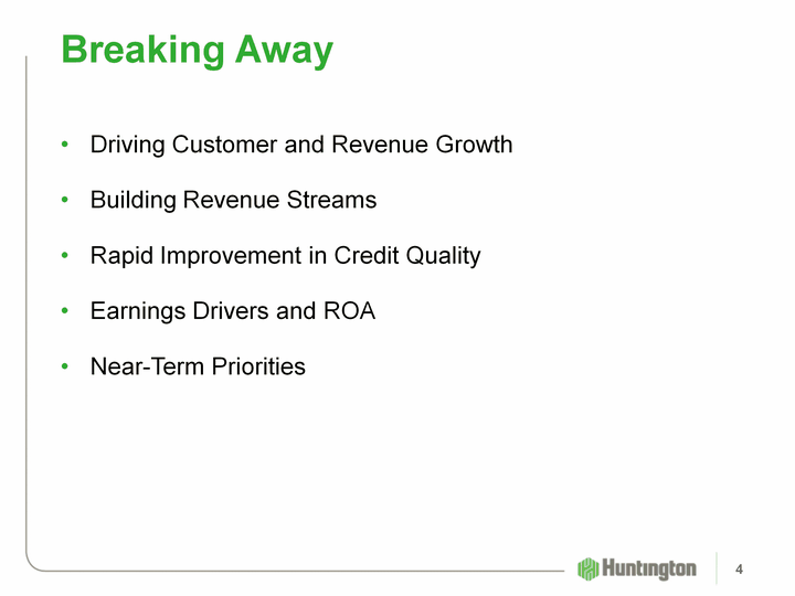 | Driving Customer and Revenue GrowthBuilding Revenue StreamsRapid Improvement in Credit QualityEarnings Drivers and ROANear-Term Priorities Breaking Away 4 |