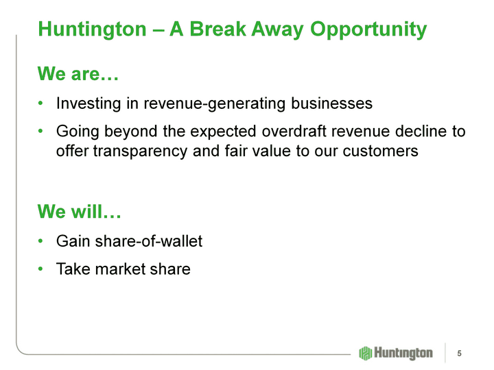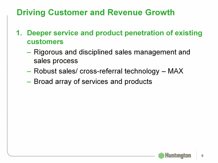 | We are...Investing in revenue-generating businessesGoing beyond the expected overdraft revenue decline to offer transparency and fair value to our customersWe will...Gain share-of-walletTake market share Huntington - A Break Away Opportunity 5 |