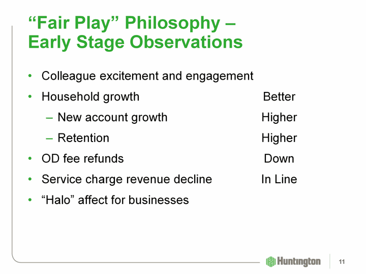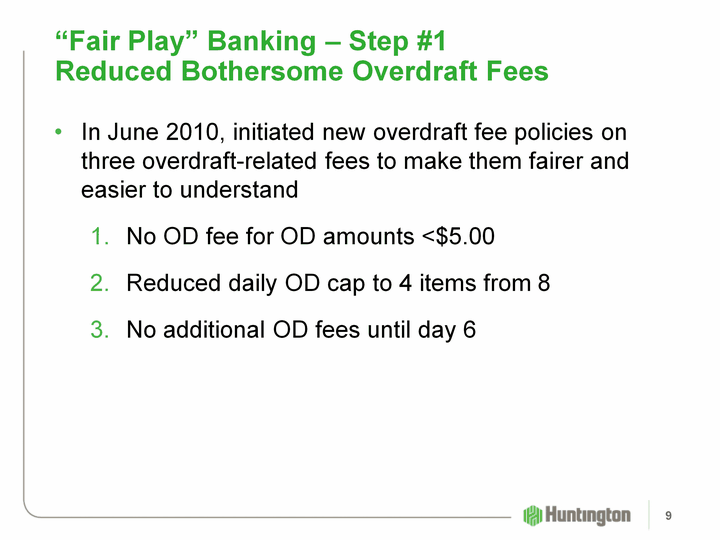 | "Fair Play" Banking - Step #1 Reduced Bothersome Overdraft Fees 9 In June 2010, initiated new overdraft fee policies on three overdraft-related fees to make them fairer and easier to understandNo OD fee for OD amounts <$5.00Reduced daily OD cap to 4 items from 8No additional OD fees until day 6 |