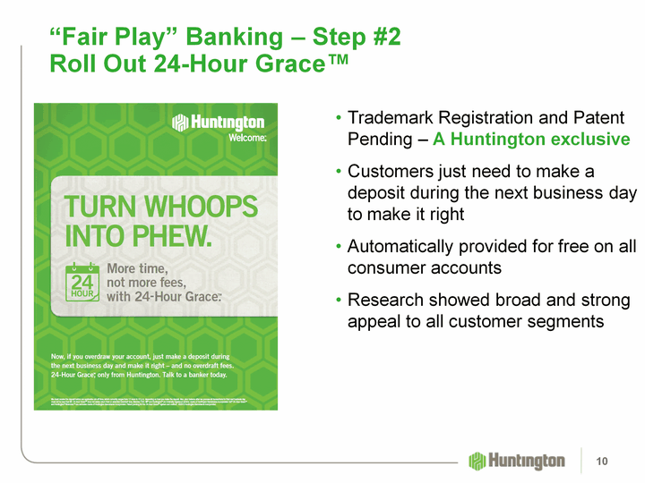 | "Fair Play" Banking - Step #2 Roll Out 24-Hour Grace(tm) 10 Trademark Registration and Patent Pending - A Huntington exclusiveCustomers just need to make a deposit during the next business day to make it rightAutomatically provided for free on all consumer accountsResearch showed broad and strong appeal to all customer segments |