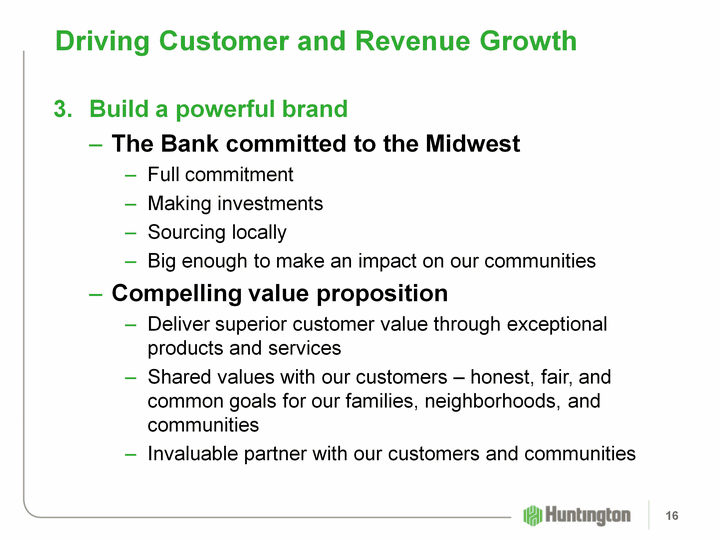 | Driving Customer and Revenue Growth 16 Build a powerful brandThe Bank committed to the MidwestFull commitmentMaking investmentsSourcing locallyBig enough to make an impact on our communitiesCompelling value propositionDeliver superior customer value through exceptional products and servicesShared values with our customers - honest, fair, and common goals for our families, neighborhoods, and communitiesInvaluable partner with our customers and communities |