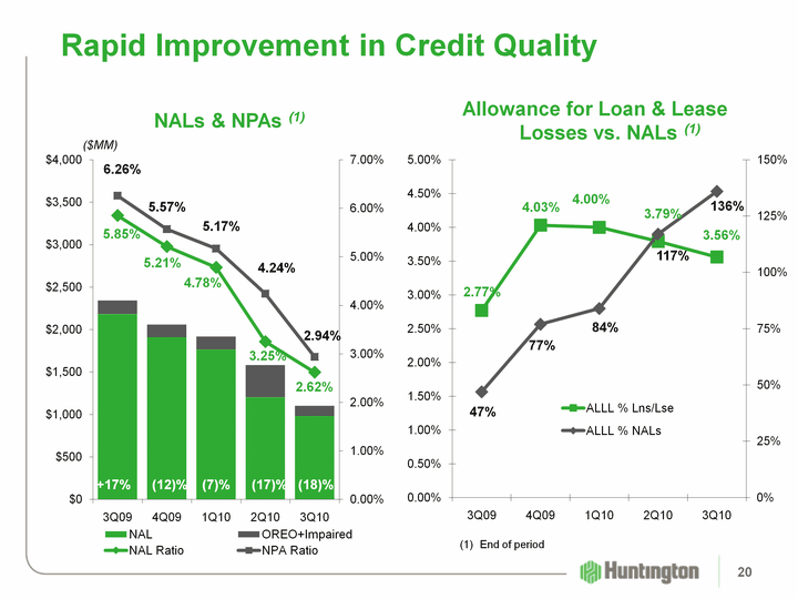| (CHART) Rapid Improvement in Credit Quality 20 ($MM) (28)% +20% (45)% (17)% +17% (12)% (7)% (52)% NALs & NPAs (1) (18)% 62% (CHART) Allowance for Loan & Lease Losses vs. NALs (1) (1) End of period |