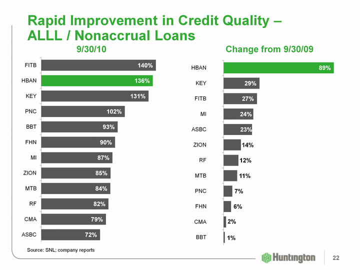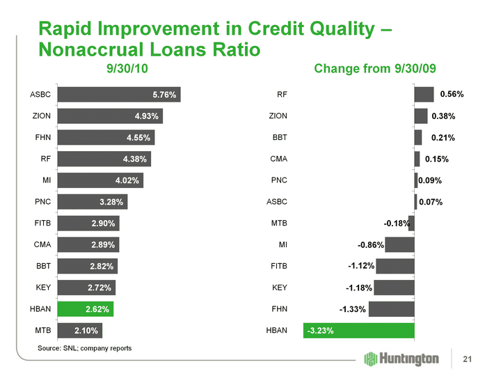 | Rapid Improvement in Credit Quality - Nonaccrual Loans Ratio 21 9/30/10 (CHART) Change from 9/30/09 (CHART) Source: SNL; company reports |