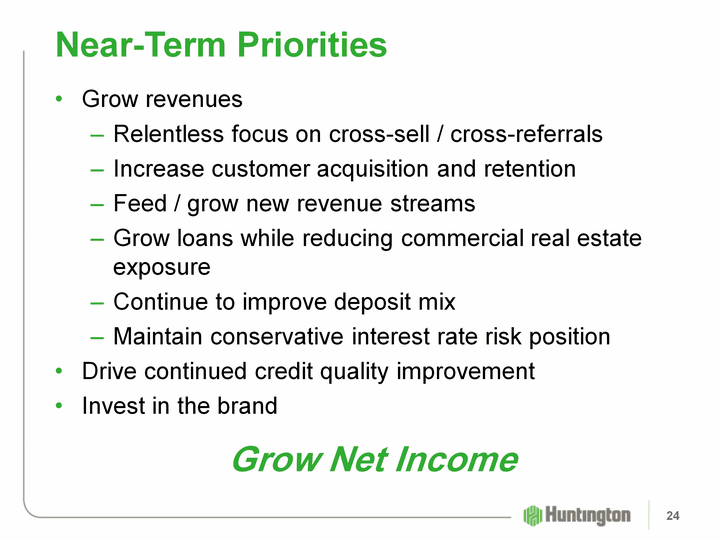| Grow revenuesRelentless focus on cross-sell / cross-referralsIncrease customer acquisition and retentionFeed / grow new revenue streamsGrow loans while reducing commercial real estate exposureContinue to improve deposit mixMaintain conservative interest rate risk positionDrive continued credit quality improvementInvest in the brandGrow Net Income Near-Term Priorities 24 |