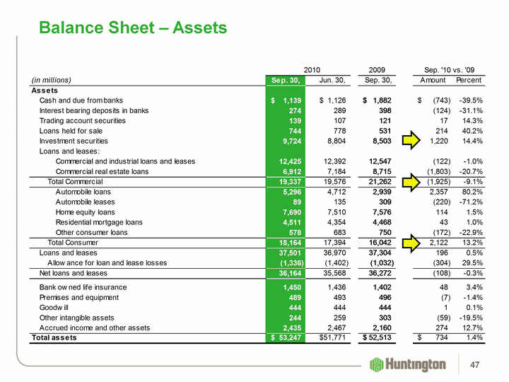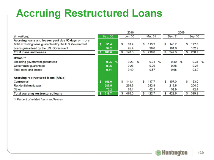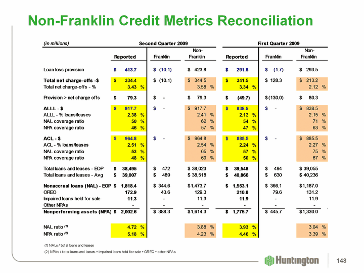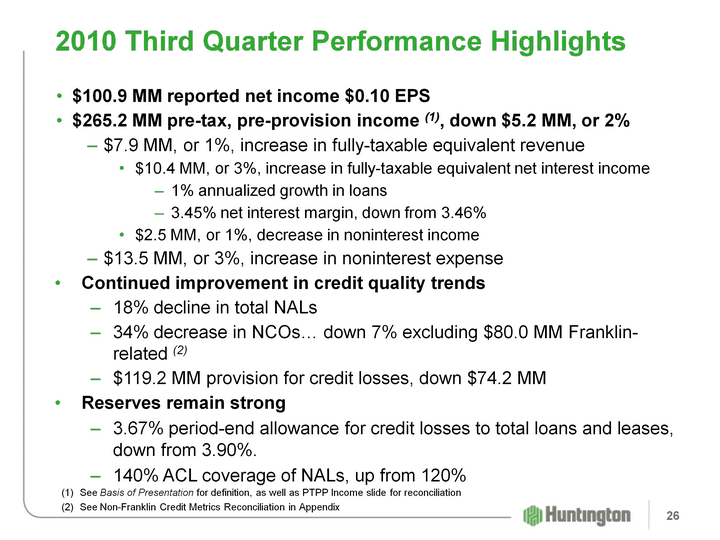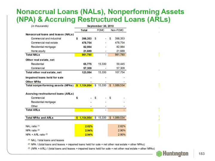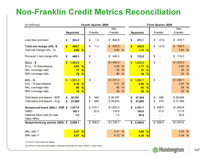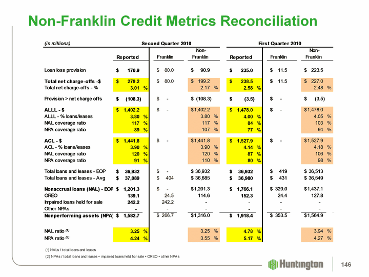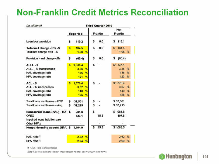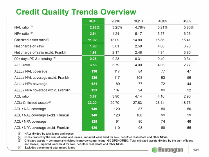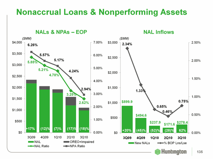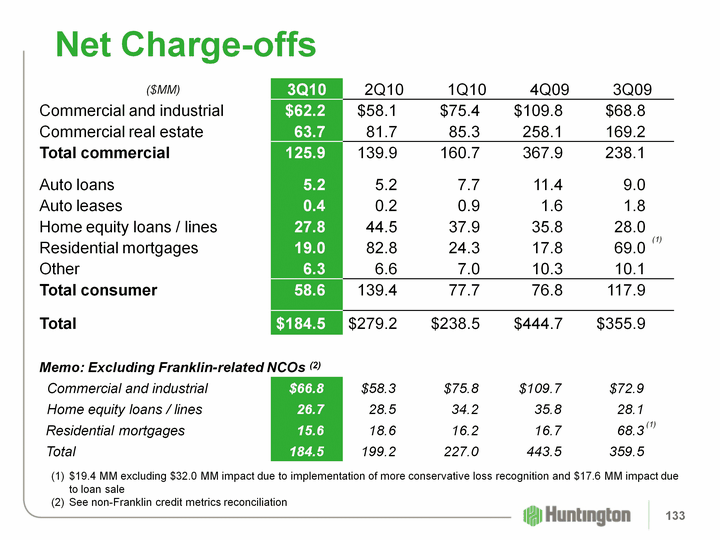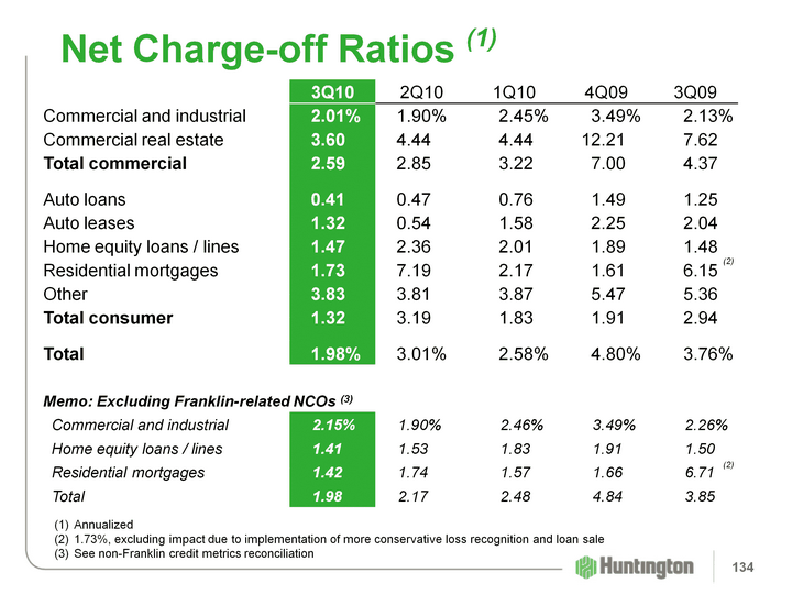 | Net Charge-off Ratios (1) 134 3Q10 2Q10 1Q10 4Q09 3Q09 Commercial and industrial 2.01% 1.90% 2.45% 3.49% 2.13% Commercial real estate 3.60 4.44 4.44 12.21 7.62 Total commercial 2.59 2.85 3.22 7.00 4.37 Auto loans 0.41 0.47 0.76 1.49 1.25 Auto leases 1.32 0.54 1.58 2.25 2.04 Home equity loans / lines 1.47 2.36 2.01 1.89 1.48 Residential mortgages 1.73 7.19 2.17 1.61 6.15 Other 3.83 3.81 3.87 5.47 5.36 Total consumer 1.32 3.19 1.83 1.91 2.94 Total 1.98% 3.01% 2.58% 4.80% 3.76% Memo: Excluding Franklin-related NCOs (3) Memo: Excluding Franklin-related NCOs (3) Memo: Excluding Franklin-related NCOs (3) Commercial and industrial 2.15% 1.90% 2.46% 3.49% 2.26% Home equity loans / lines 1.41 1.53 1.83 1.91 1.50 Residential mortgages 1.42 1.74 1.57 1.66 6.71 Total 1.98 2.17 2.48 4.84 3.85 Annualized1.73%, excluding impact due to implementation of more conservative loss recognition and loan saleSee non-Franklin credit metrics reconciliation (2) (2) |