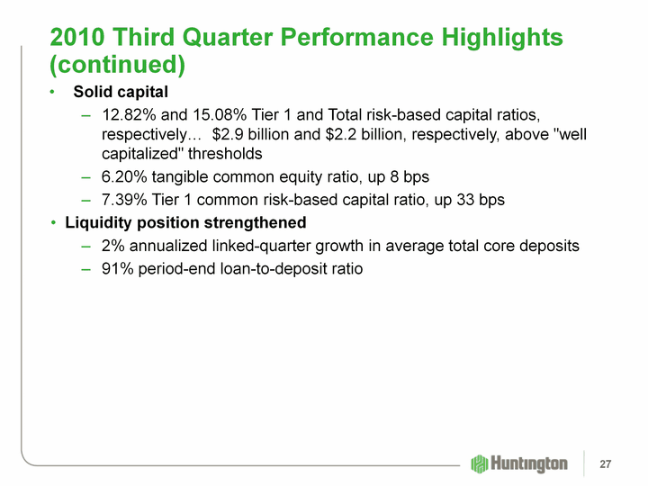 | Solid capital12.82% and 15.08% Tier 1 and Total risk-based capital ratios, respectively... $2.9 billion and $2.2 billion, respectively, above "well capitalized" thresholds6.20% tangible common equity ratio, up 8 bps7.39% Tier 1 common risk-based capital ratio, up 33 bpsLiquidity position strengthened2% annualized linked-quarter growth in average total core deposits91% period-end loan-to-deposit ratio 2010 Third Quarter Performance Highlights (continued) 27 |